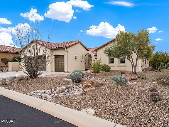 Exceptional Mirasol floor plan located in the exclusive SaddleBrooke Ranch gated community. This expanded 2 bedroom 2.5 bath home is a true gem and an entertainer's dream. Designed for effortless one-story living, this much sought-after floor plan boasts a premium location nestled in the heart of the neighborhood. Step inside the spacious front courtyard, that offers additional entertaining space, through the front door, and past the beautiful sit-up bar, you are greeted with an amazing space that flows effortlessly into the kitchen, dining, and great room. You will be delighted with the stunning plantation shutters throughout the home. The kitchen is a chef's dream, with upgraded quartz countertops, stainless-steel appliances, and plenty of storage. Enjoy outdoor entertaining in your fully landscaped back yard with enclosed patio. This split floorplan allows you and your guests plenty of privacy. The oversized, expanded garage can easily store your vehicles and two golf carts. This home is very well maintained and loaded with upgrades. This one is a Must See!!