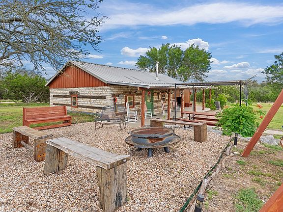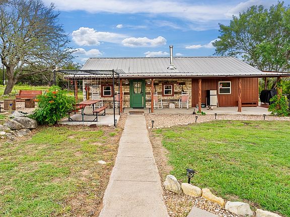 Tucked away just a mile down the road from the legendary Luckenbach, Texas, this scenic 8-acre property offers the perfect blend of rustic charm and modern convenience. The main home, built of stone and timber, features one oversized bedroom, two full bathrooms, and a spacious open-concept living and kitchen area-ideal for entertaining or simply soaking in the serene surroundings. Take in sweeping Hill Country views and stunning sunsets from both the front and back porches. Two charming guest cabins-currently leased month-to-month-provide immediate rental income potential or space for guests. A large barn offers ample storage, complemented by a two-car carport and a beautifully crafted stone tank house that serves as a utility room. Fully perimeter-fenced and surrounded by rolling hills, this property is a rare opportunity to own your own slice of Texas tranquility, with the music and magic of Luckenbach just down the road.