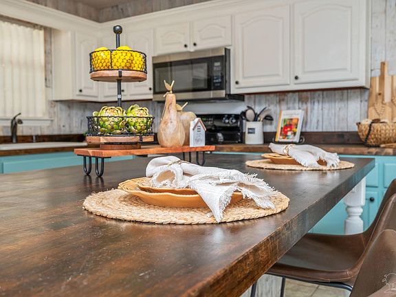 Welcome home! Tucked in a quiet loop-style neighborhood accessible from Dogwood Drive or Stewart Street, this home blends charm, comfort, and convenience. You'll love the farmhouse-inspired kitchen with reclaimed-style whitewashed wood paneling, butcher block counters, stainless steel appliances, and a spacious island bar. The split floor plan offers privacy, and the primary suite features a double vanity and soaking tub. Relax on the covered back patio overlooking the privacy-fenced yard with a 12 X 24 aluminum storage building. Gutters & downspouts and a 2023 roof, move-in ready and easy to love!
