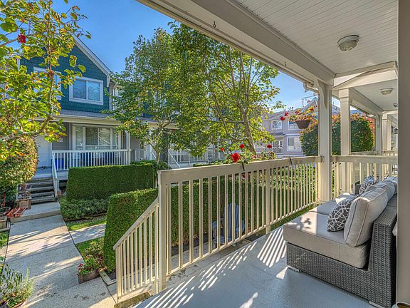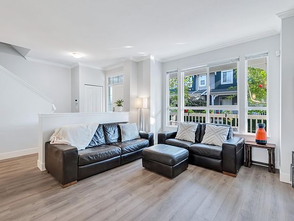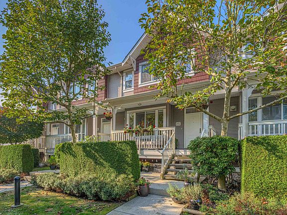 Fantastic Location! Steps to waterfront & walking distance to Steveston Village, shopping, restaurants & more. This Heritage style 3bed+ flexroom townhome is nestled in the well maintained complex of RiverWind. Featuring 1695 sqft of bright interior living space, in addition to a quaint covered front porch, a lovely front patio & a balcony off the kitchen. Open concept layout on the main floor with powder room & 9' ceilings, 3 beds/2baths up & a flex space below next to the large 2 car garage. The kitchen has plenty of storage, a breakfast bar, newer SS appliances & a gas hook-up on deck. Primary bedroom offers a walk-in-closet with built in organizers & renovated master bath -heated floors & a Spa like shower. New paint, flooring, baseboards/casings throughout. Open House Oct. 29/30 2-4pm