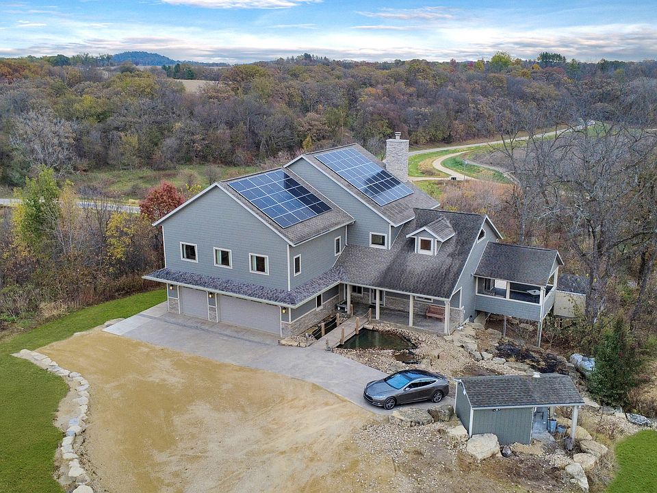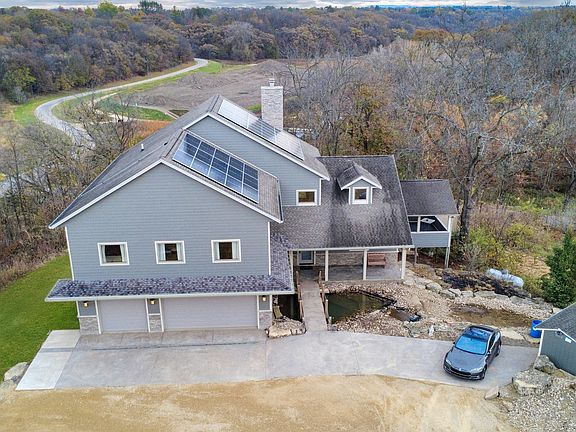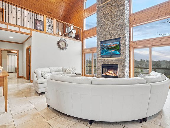 Standing proudly on a private 2.55-acre cul-de-sac lot, this stunning 5-bedroom, 6.5-bathroom home showcases three levels of exceptional design, craftsmanship, and modern efficiency. Equipped with solar panels, this home combines timeless elegance with sustainable living. The main floor welcomes you with an open-concept layout featuring one of two luxurious owner's suites, a dedicated office, and a spacious living room centered around a dramatic floor-to-ceiling fireplace. The gourmet kitchen offers a large island, generous dining space, and seamless access to the screened porch-perfect for relaxing or entertaining. Upstairs, you'll find the second owner's suite, complete with a private balcony, a convenient laundry room, a large bonus room, and an additional bedroom and bath. The walkout lower level continues to impress with two more bedrooms with private en-suites full bar area, a side-load garage, and a massive walk-in safe/safe room. Heated floors throughout provide year-round comfort. Step outside to enjoy the expansive rear deck and charming playhouse, beautifully finished with hickory flooring and electricity. With its solar-powered efficiency, refined finishes, and exceptional layout, this property offers a rare blend of luxury, innovation, and tranquility.