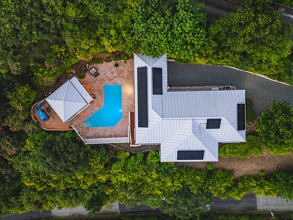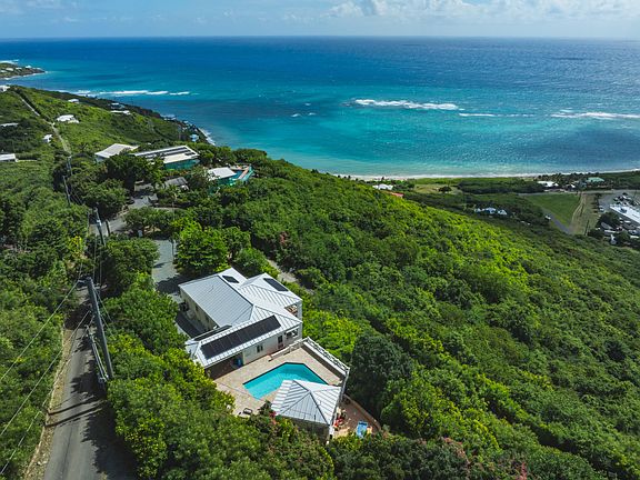 Nestled in the leafy enclave of Maggie Hill is this furnished, turn-key, 2 bedroom, 2 bath home with a pool, solar, central AC and mini splits, a studio cottage, lush landscaping and sweeping views of the South Shore. Gorgeous ocean blues fill the open floor plan through huge windows that line the entire southern exposure of the home. A terraced front yard filled with trees, perfect for dogs - the entire property has been fully fenced. Meticulously maintained....the Sellers have completed a multitude of improvements in the short time, they have owned the property - a full list of improvements is in the documents section. Perfect as a first or second home or turnkey vacation rental! (continued) The kitchen features new appliances, new backsplash tile, granite countertops, a separate wine fridge and a large pantry. The kitchen has a west facing door for easy access to the pool and grill when entertaining. The dining table with upholstered bench provides for comfy and relaxing meals while starring out at the ocean. There is enough seating for more than 10 people comfortably at this window seat bench/dining area. There are many areas to lounge in this home. The spacious covered deck off the two living rooms has lots of cozy seating for ocean gazing or watching the activity down at Divi. The second living room leads to two bedrooms, both with their own bathroom. The primary bedroom has a large seating area, its own exit to the driveway, a walk-in closet and a dressing room between the ensuite bathroom and closet -any clotheshorse dream come true. The guest bathroom has been redone.