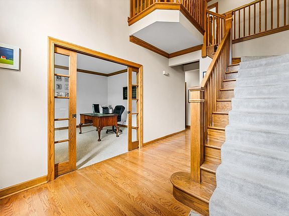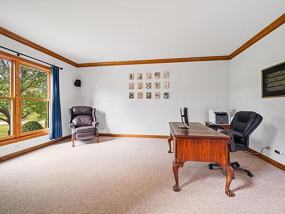 Stately brick-front home on a private lot with a deep backyard and gorgeous paver patio in an exclusive private enclave of Deer Run! Step inside the 2-story foyer with oak hardwood floors and crown molding that flow through to the kitchen. The spacious living room features pocket French doors and crown molding, while the formal dining room offers a chair rail, crown molding, custom recessed ceiling, and a wood-cased opening to the kitchen. The chef's kitchen impresses with 42" hickory cabinetry w/crown trim, granite countertops, stainless steel appliances, breakfast bar/island, pantry closet, planning desk, recessed lighting, and a bright eating area with slider to the patio. The family room has a vaulted beamed ceiling, floor-to-ceiling brick fireplace, and a big bay window overlooking the yard. A main-floor den or 5th bedroom with French doors and adjacent powder room makes a perfect guest suite. The large laundry/mudroom includes a sink, storage closets, and access to the garage and side yard. The highlight of the main floor is the 3-season sunroom with vaulted tongue-and-groove ceiling, walls of adjustable windows, skylights, panoramic views, and patio access. Upstairs, the primary suite boasts a tray ceiling, sitting area, two walk-in closets (one is 28x8!), and a luxury bath with vaulted ceiling, skylight, dual sink granite top vanity, corner whirlpool tub, and separate shower. Three generous secondary bedrooms-one with a vaulted ceiling-share a hall bath with dual sink granite top vanity and tub/shower combo. The full walk-out basement offers endless possibilities for future finishing. 3-car side-load garage, custom paver walkway, and paver patio offering beautiful outdoor entertaining space complete the package. Ideally located just minutes from downtown St. Charles and Randall Road shopping and dining! Come and take a look!