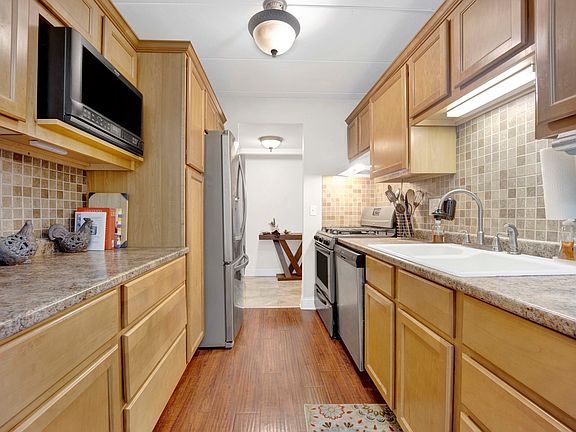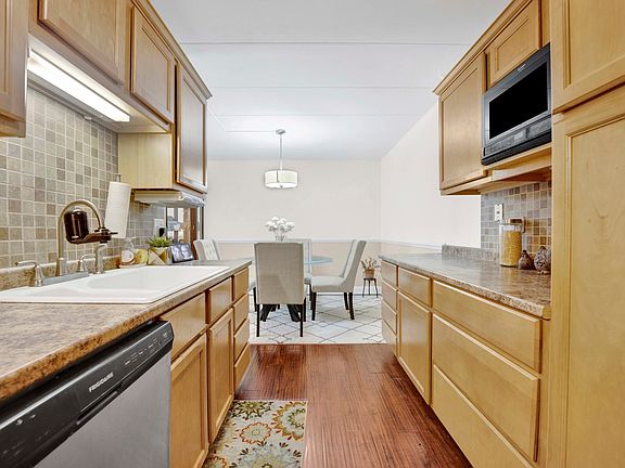 Step into this stunning two bedroom - 1.5 bath condo. As soon as you step in you will enjoy an abundance or natural light. The galley kitchen is a highlight with stainless steel appliances and a spacious eat-in area. The family room leads to an extra-large balcony with amazing views, accessible from both the family room and second bedroom. It offers an in unit new washer and dryer, as well as air conditioning unit. This well-maintained building offers convenient elevator access and a heated lower level garage with one assigned space and private storage. The HOA fee covers Heat, Water, Gas, Parking, Exterior Maintenance, Lawn Care, Scavenger, Snow Removal, and Common Insurance. Conveniently located just two minutes from the train station, shopping and restaurants.
