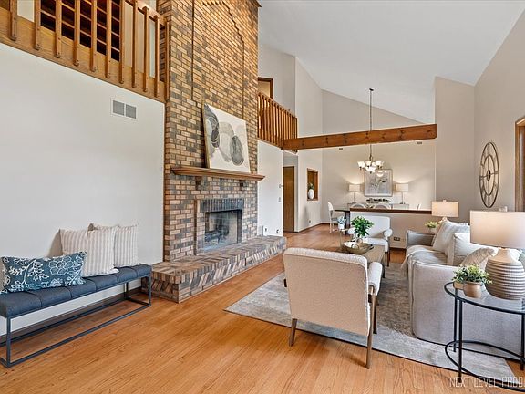 Tucked into a private setting of mature trees and peaceful ravines, this captivating home offers a first-floor in-law or guest bedroom with an adjacent full bath and a layout designed for today's lifestyle. The open-concept design is both family-friendly and flexible, offering comfortable living and effortless entertaining. A dual-sided fireplace connects the living room to the spacious family room and kitchen, creating warmth and charm while showcasing tranquil views of the grounds. Step outside to the oversized deck, an ideal spot for outdoor gatherings that flow naturally into the serene landscape. Inside, you are welcomed into a completely vaulted front room with an inviting living and dining area that seamlessly flows into the kitchen. Gleaming hardwood floors are found throughout. The true first-floor bedroom with adjacent full bath is perfect for guests or multigenerational living. Upstairs, the oversized primary suite features an oversized private bath with whirlpool tub and separate shower. A second generously sized bedroom with walk-in closet and full hall bath completes the upper level. Outdoors, the possibilities are endless and ready for your personal vision. From morning to evening, enjoy all this property has to offer, whether it's playing on the open lawn, exploring the wooded trails, or simply relaxing in your own backyard. The perfect balance of peace and fun. Just minutes from I-88, shopping, Waubonsee Community College and more. An opportunity not to be missed! Roof (2024), Windows (2024), Pressure Tank (2024), Septic cleaning (2025), A/C (2021), Furnace (2015)