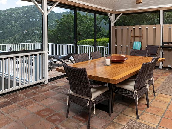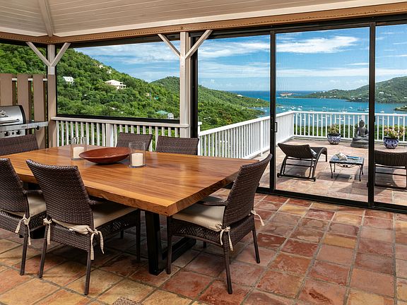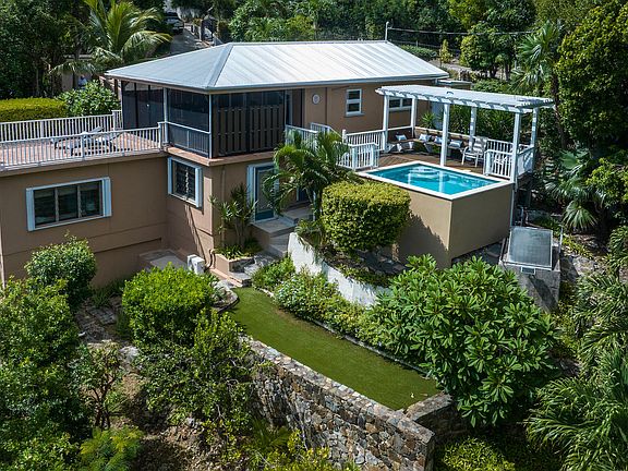 Eastgate is an immaculately cared for TURNKEY 2-UNIT property located on a 1/2 acre on aquaint cul de sac. Upper level consists of 2 bedrooms, 1.5 baths, custom kitchen w/quartz counter tops,mahogany cabinets & accents & a cozy great room that extends to screened porch & tiled deck. Lower level 1 bedroom, 1 bath apartment offers a 2nd kitchen also w/mahogany accents/cabinets & vanities, separate covered porch & 2nd set of washer/dryer. The masonry salt pool, perched perfectly above Coral Bay Habor, is accented with a Red Locust deck. The entire property is fenced w/gated driveway & stoneterraced walls. Amenities include a/c throughout, generator power, UV filtration, hardwood interior doors, granite bathroom countertops & newer PGT windows/doors, hot water heaters & roof metal.
