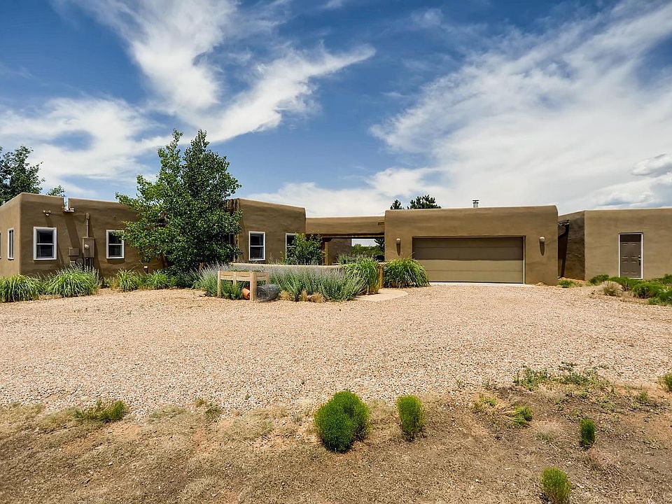 Located on a 1.6 acre high view lot sits a stunning home built in 2006. It is 4 bedrooms or 3 bedrooms plus a dedicated den/study with separate entrance. 3 bathrooms (2 full and 1 - 3/4) Gorgeous outdoor spaces with walled courtyards, brick portals, a water feature and established large Pine and Aspen trees. Admire all 3 mountain ranges from this home. Phenomenal views of Jemez mountains from living and dining room and the back portal/courtyard. Sangre de Cristo views enjoyed from the front courtyard, and see the Sandias from the bedrooms on south side. Quality classic Santa Fe finishes, diamond finish plaster, kiva fireplace, skylights, square beamed ceilings and brick floors throughout. Master bathroom has double sinks, large soaking tub, separate shower and large walk-in closet. This home has plenty of storage, large closets and large laundry room. There is also an oversized 2 car garage and a separate storage 12 X16 finished storage or potential workshop. The home has natural gas with in floor radiant heat and has a private well.