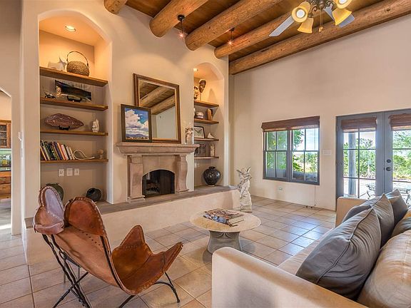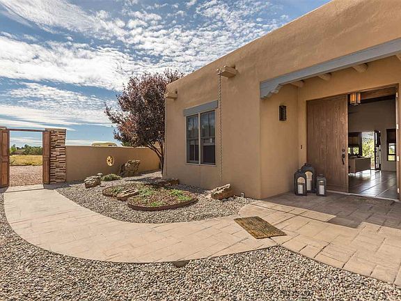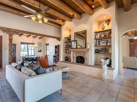 This elegant Bryan Marsh custom-built home in the Avila area of Eldorado sits on 1.6 acres in a lovely cul-de-sac, blends Southwestern touches of vigas and nichos with gracious livability and a spacious open floor plan. The stunning living room features 12 ceilings a Canterra Stone double facing fireplace, built in display shelves, and French Doors opening to a beautiful portal to enjoy spectacular sunset views and expansive vistas of the Ortiz and Sandia mountains. Yard is fully landscaped with easy care plantings. Cooks Kitchen has Jenn-Air range, flexible space for use as an eat-in area, or family room, has had recent upgrades of quartz island and counter tops, Restoration Hardware cabinet handles, fixtures, and new lighting. Separate dining area creates good flow and makes an excellent space for entertaining. New ceiling fans and custom window treatments throughout. New courtyard wall with stacked stone entry was added for privacy and to create an additional outdoor space. Master Suite has great separation from the 2 other bedrooms, spacious bath with dual vanities, generous walk in closet, and walk out to back portal. Eldorado features specular night skies for star gazing, has extensive walking and biking paths, hundreds of acres of Wilderness Preserve for hiking, a K- to 9th school, library, shopping, restaurants, summer time pool, dog park, More. Choice!