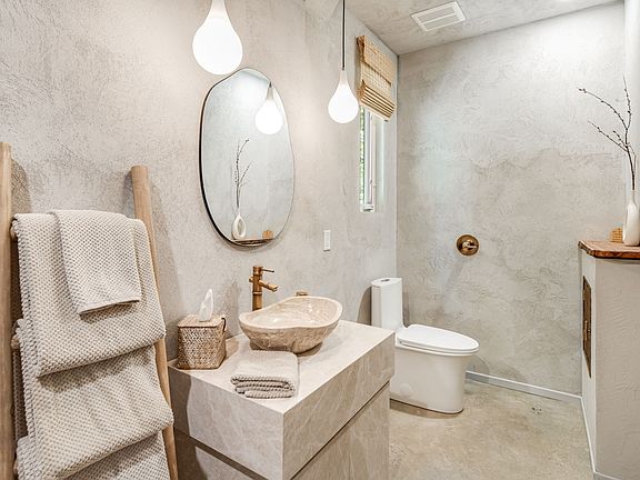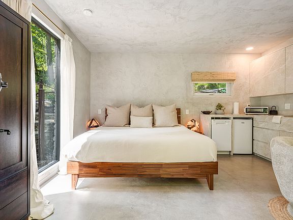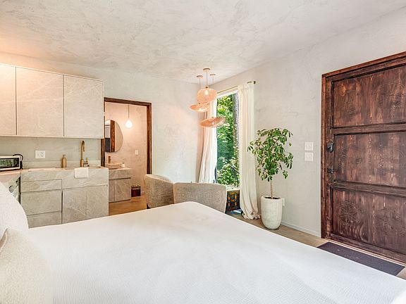 The space is stuccoed with stone floors, custom designed marble cabinets in bathroom and in kitchen, and stone shower features. Its a smaller space, perfect for a single person or a couple that love spending time together!