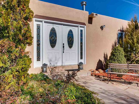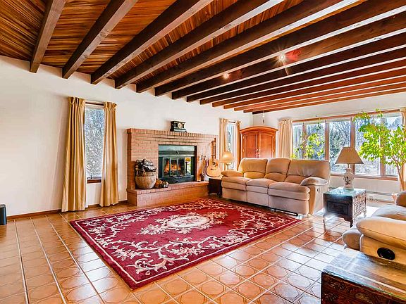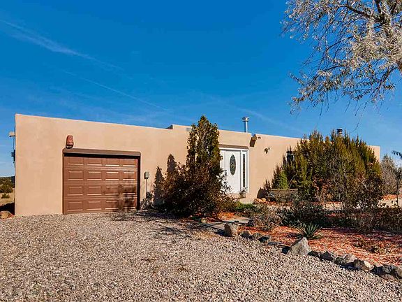 Spacious Eldorado home with Mountain Views! Centrally located and close to paved access this 1975 sq.ft passive solar home includes natural gas hot water baseboard heat. A wood stove in the dining room and a heatalator fireplace in a large living room makes for cozy winters. There is a half bath for visitors, a full guest bath for the 2 guest bedrooms and the separate master suite. The foam roof has a EPDM synthetic covering added in 2015, and the home has been well maintained. A lovely private rear view deck, garden and walled patio is perfect for entertaining. There is an RV transfer switch/generator hook up and dump station for visiting guests and an oversized 1 car finished garage. Although not Santa Fe in style this home has a lot to offer.
