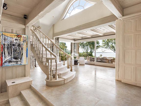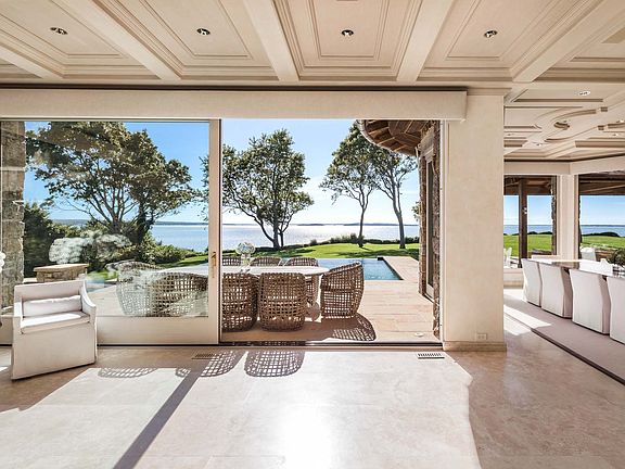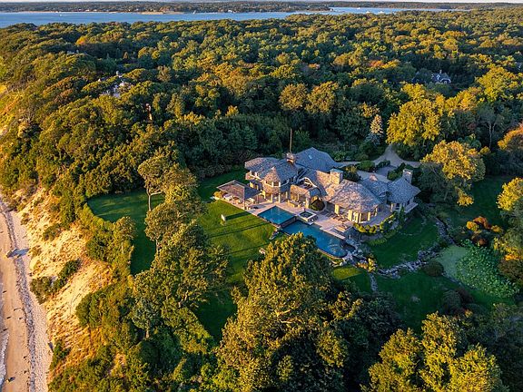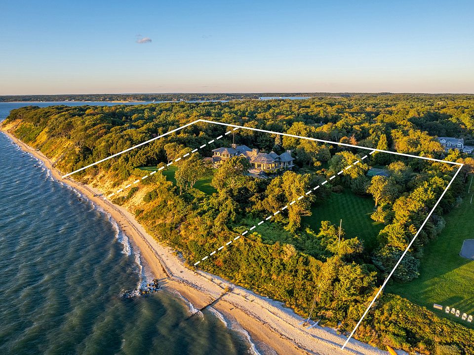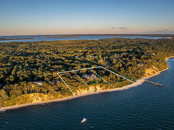 Elevated 50' high on the bluffs of the North Haven Point gated community lies this 6.5 acre+/- waterfront compound, offering sweeping views over Noyack Bay and Shelter Island. This world-class 12,000 SF+/- residence is comprised of 6 bedrooms, 6 full and 2 half bathrooms, dual gated entries at the end of quiet cul-de-sacs, infinity-edge pool, tennis court, and community beach access.