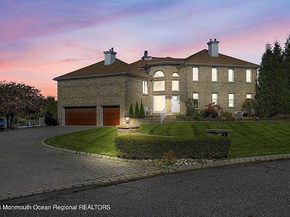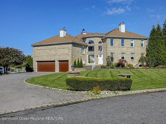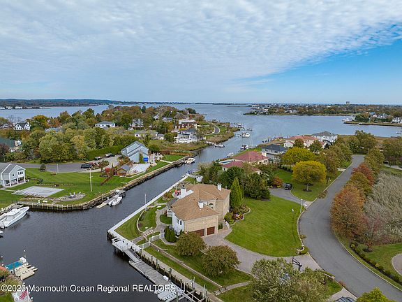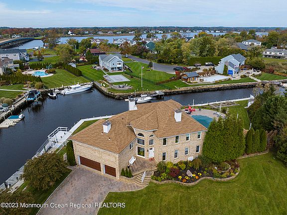 6 Blue Point Cove in Oceanport beckons the discerning buyer with an appetite for refined luxury. Nestled on a prime corner lot, this waterfront gem boasts an impressive 400 feet bulkhead on the pristine Blackberry Bay Lagoon. Traversing the property, you'll find the subtle integration of modernity and opulence; from the dual 30'' Blomberg refrigerators and the Viking Series 5 stove in the chef's kitchen to the two-story open plan family room with gas fireplace and oversized palladium window atop an expanse of sliding glass doors that open onto the pergola-covered bluestone patio overlooking the water. A generously sized dining room features another wall of sliding glass doors, opening onto a tiered paver patio. The upper level hosts the bedrooms, including the lavish primary suit Venturing outside, the freshly installed Gunite pool glints under the sun, its temperature always perfect thanks to the new Halyard pool heater. For those seeking relaxation, the Grande hot tub awaits, complemented by an outdoor shower for a refreshing rinse. Culinary enthusiasts will revel in the Sedona outdoor grill, Kalamazoo pizza oven, and the OCS side burner - perfect for weekend barbecues or intimate gatherings under the stars. A tiki bar adds a touch of tropical flair, ensuring every moment spent outdoors feels like a mini-vacation.