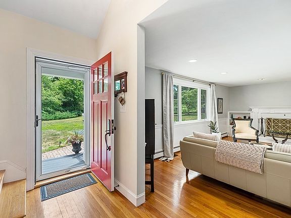 Tucked behind mature landscaping on a private 1.49-acre lot, this sunny and beautifully maintained 5-bedroom, 3-bath Cape is a hidden gem in Wenham’s desirable Lord’s Hill neighborhood. Enjoy an open floor plan, gleaming hardwood floors and expansive windows throughout. At the heart of the home is a custom kitchen featuring granite counters, stainless appliances, breakfast bar and dining area with sliders to a multilevel deck. The kitchen opens seamlessly into the family room, dining room, and living room with fireplace and custom built-ins. The main level offers 3 bedrooms, including one with an en-suite bath, plus an additional full bathroom. Upstairs, discover 2 more bedrooms including the primary suite with a walk-in closet and en-suite bath. Enjoy the professionally landscaped yard from your expansive deck. Two-car garage, central air. Located in an established neighborhood with top-rated schools and easy access to highways and the commuter rail. Must see!
