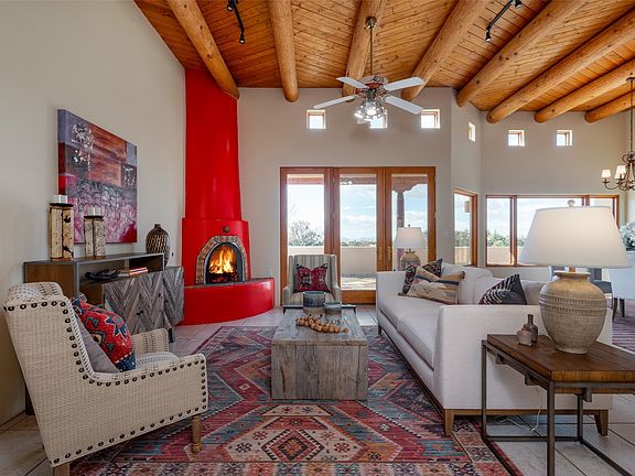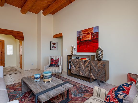 Welcome to this move in ready and easy-care Eldorado home! As you step inside, you're greeted by an inviting open floor plan, highlighted by the soaring cathedral ceilings with traditional vigas. Natural light floods the space, enhancing the warm and welcoming atmosphere. The oversized owner's suite is a true sanctuary, featuring a luxurious jetted tub, large walk in shower, and sauna, perfect for unwinding after a long day. The large walk-in closet provides ample storage, while the attached office offers a convenient workspace. For the creative soul, the three-car garage supports an attached heated studio/ workshop space. Two covered portals feature breathtaking mountain views and west-facing sunset vistas for enjoying a quiet evening at home or entertaining your guests in an outdoor space that is sure to impress. Don't miss your chance to own this Eldorado gem carefully crafted for easy living and timeless elegance.