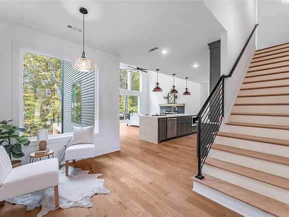 This modern contemporary home has high-end finishes with a very comfortable layout. Walk in to 20' ceiling and floor to ceiling windows that let in the beauty of the treed backyard and deck. The large living room has a fireplace to enjoy and easy to entertain layout. The unique kitchen features quartz counters and designer tile backsplash,built in microwave and a full extra counter for coffee bar or prep work.Brass lighting over the island rounds out look. The built in cabinets along the side are a surprise addition.The master suite on the main level connects to a spa-like bath with dual sinks,custom shower and soaking tub. The roomy closet features a nice window for extra light.There is also a half bath on main level for convenience. Laundry room and pantry are next to the garage entry. The 2nd floor has 3 bedrooms and a full bath with dual sinks. There is a large bonus area for office or playroom. The 23x10 deck will be a great hangout place to enjoy nature. The garage floor has an epoxy finish added.