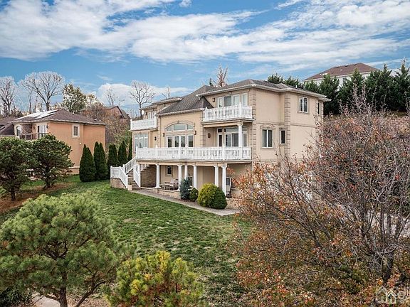 Luxury Living! Impressive, waterfront, 4bdrm, 4bath contemporary multi-level home tucked away on private Cul de sac. The four balconies offer breathtaking views of the NY skyline, Verrazano bridge & Raritan Bay. Minutes from NY train, restaurants, shops and parks plus EZ access to main roads makes this location extremely desirable. High quality, well-built home features poured concrete foundation*ground level entry into day light finished basement*Amazing primary bdrm*open floor plan*interior upper-level balcony overlooks beautiful family rm & foyer*European style kitchen with stainless steel appliances opens to elegant Formal Dining room*attractive paver patio in resort like yd. Ideal for entertaining inside & out. Over 3,000 sq ft of living space. A MUST SEE!