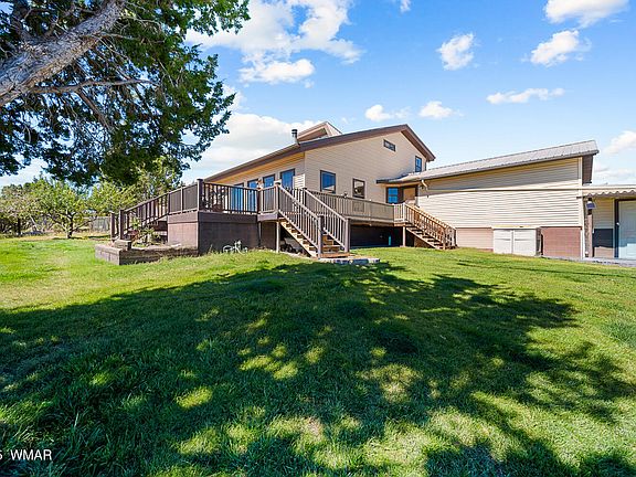 Enjoy incredible panoramic views of Concho Lake and the surrounding mountain ranges from this unique home featuring a passive solar design for comfort and efficiency. Relax or entertain on the spacious back deck, overlooking a fenced yard with a lush lawn and fruit-bearing Red and Golden Delicious apple trees. A rainwater harvesting system, workshop, partial solar system, two-car garage with additional covered parking, and 20' storage container add functionality and convenience. Don't miss this one-of-a-kind property blending natural beauty with practical living.