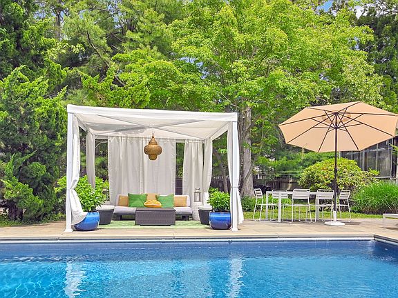 Wooded property and seasonal variety landscaping surround this traditional ranch. Updated kitchen with island counter and eat-in dining space. Screened in furnished porch and out door breakfast area off kitchen. One level home features en suite master plus two bedrooms and additional bath. Spacious light filled living room with fireplace and window seat and dining area. Separate home office structure. Heated Vinyl Pool and Cabana area. Attached garage. Stylish comfort throughout. CAC Silver Beach Association beach rights. Shelter Island Rental #2023-L-001