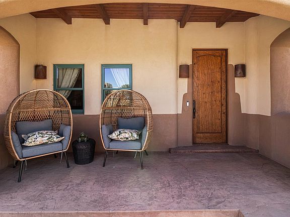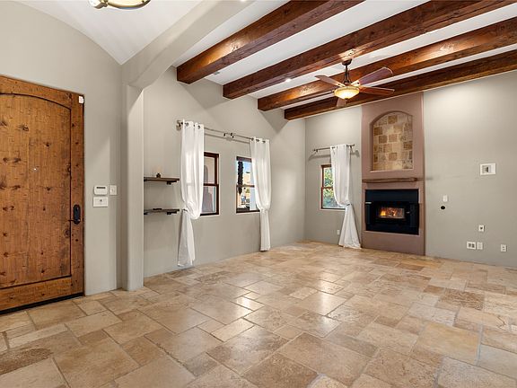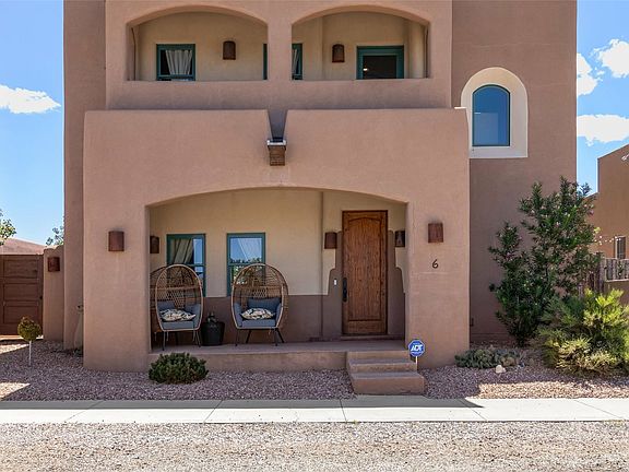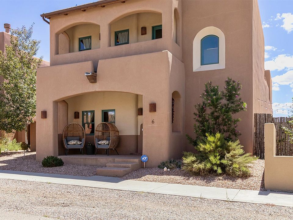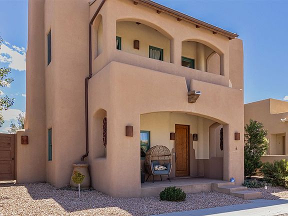 Outstanding character and design in this Oshara Village home - one of the best values currently on the market. 3 bedroom, 4 bath with superb design details and craftsmanship. Welcoming exterior front cove porch with generous hand-scraped door opens to the living room with beautiful square Vigas and traditional Santa Fe style. A raised fireplace with an inset for art above adds charm to the space which opens to the spacious dining room. The dining area has access to the serene and very private outdoor living area. The Chef’s kitchen is adjacent to the dining & living areas and has it all - custom cabinetry, undermount lighting, granite tile countertops, stainless steel appliances, professional Viking fridge/freezer and pantry. The large laundry room with utility sink, and the primary suite are on the main level. Primary suite offers everything you would hope for in your dream home - high coffered ceilings, bath with custom double vanities, large jacuzzi tub, walk-in shower with bench, and walk-in closet. From the living room a stairway leads to the 2nd level with a generous loft area, closet & secondary bedroom/bathroom. Lovely upstairs covered patio with all the Santa Fe touches faces north, providing mountain and sunset views. The very private outdoor spaces around this home include a stylish fountain and fireplace, raised garden beds and loads of covered patios - a truly peaceful sanctuary. 3rd bedroom/in-law quarters/studio space is accessed from the backyard with separate entrance through upstairs balcony. The Community of Oshara Village truly has one of the most charming Plazas in Santa Fe, with mature lawns, trees and art display. The popular Pantry Dos serving breakfast, lunch and dinner is also within this community.