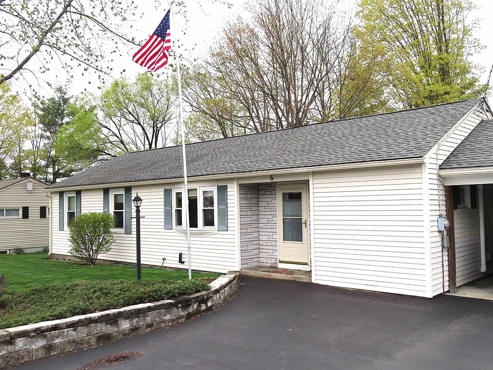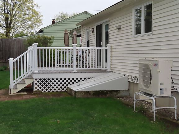 Sweet & immaculate 2 BDR Ranch w/21x16 LR, a built-in bookcase, ceiling fan, laminate flooring & patio door to 16x10 rear deck that has been upgraded to Trek decking 2 years ago. KIT w/double S/S sink & a window overlooking the groomed back yard. Nice work area & enlarged pass through from KIT countertop into the DR. DR w/triple window & hardwood flooring, opens into the LR. Very large BDR w/sitting area at one end, w/w carpeting, built-in desk, large closet & half bath. 2nd BDR has extra storage cubbies & good closet. Stackable washer & dryer are on the 1st floor, tucked into the 3/4 bath. Lower level has a good workshop area, the mechanicals & a set tup. New inner door to the bulkhead. In addition to the 1179 SF on the first floor, there is a finished 370 SF exercise room, craft room or office, behind the workshop area. This LL room has w/w carpeting & a 8x7 sewing nook w/a huge closet. Windows have been updated. Mini splits have been recently added in LR & primary BDR. Architectural shingle roof installed in 2016 & the skylight in the 3/4 bath was also replaced at that time. Carport on right side. Immaculate yard, w/a shed in the rear is partially fenced. Occupancy mid-July.