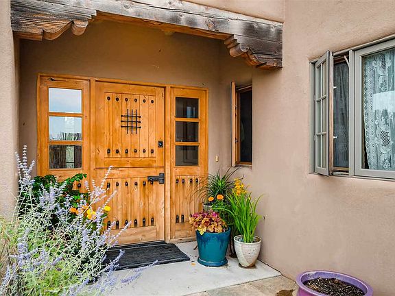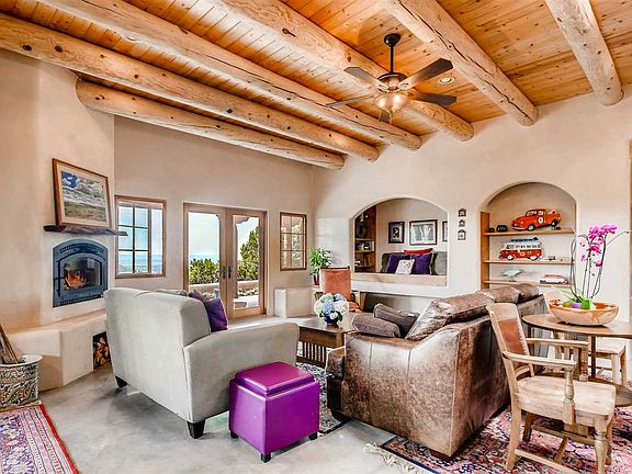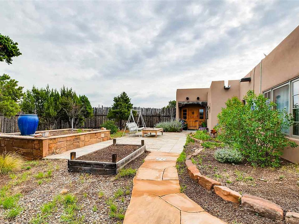 Stunning custom designed home built by Kerry Roland on a 12.7 acre hill top setting with sweeping panoramic Galisteo Basin views! In a small gated community close to paved access yet oh so private, this lovely 2700+ sq.ft home, built in 2006 is delightfully gracious with extremely livable spaces. Active solar by Solar Tech generates the radiant heat and domestic hot water with photovoltaic back up for the hot water. Upgraded kitchen with copper sinks, granite counters and a large island with salad sink. The master suite looks out over the Galisteo Basin with French doors leading to long portal for evening peaceful viewing. The guest bedroom is "En Suite" and the heated studio can be a 3rd guest bedroom area. On over private 12 acres yet close to two community shopping centers, library, school and senior center plus only minutes into Santa Fe.