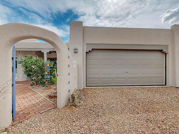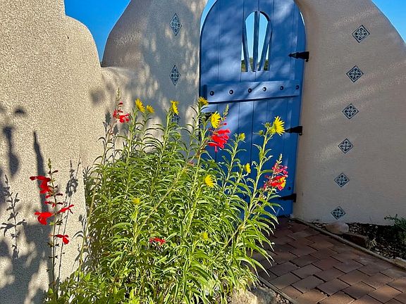 Santa Fe charm to spare in this 2-bedroom, 2-bath custom home by Sierra Homes nestled in a private spot adjacent to open space just off a rare quiet paved road in Eldorado. Lovingly enhanced with $58k in improvements over the last ten months including new stucco, new Marvin openable windows and newly coated roof (with warranty). This peaceful home boasts a private front courtyard with a shady portal wrapping a colorful pollinator garden and burbling fountain, and a back portal for alfresco dining with distant views of the Manzano Mountains, and a rock garden of native flowers and herbs. Through the custom southwest-style screen door, the front hall boasts carved corbels and a skylight; the kitchen shines with a charming eat-in bay and tongue-and-groove pine ceiling; the living room with its view through three glass doors has a pine ceiling
