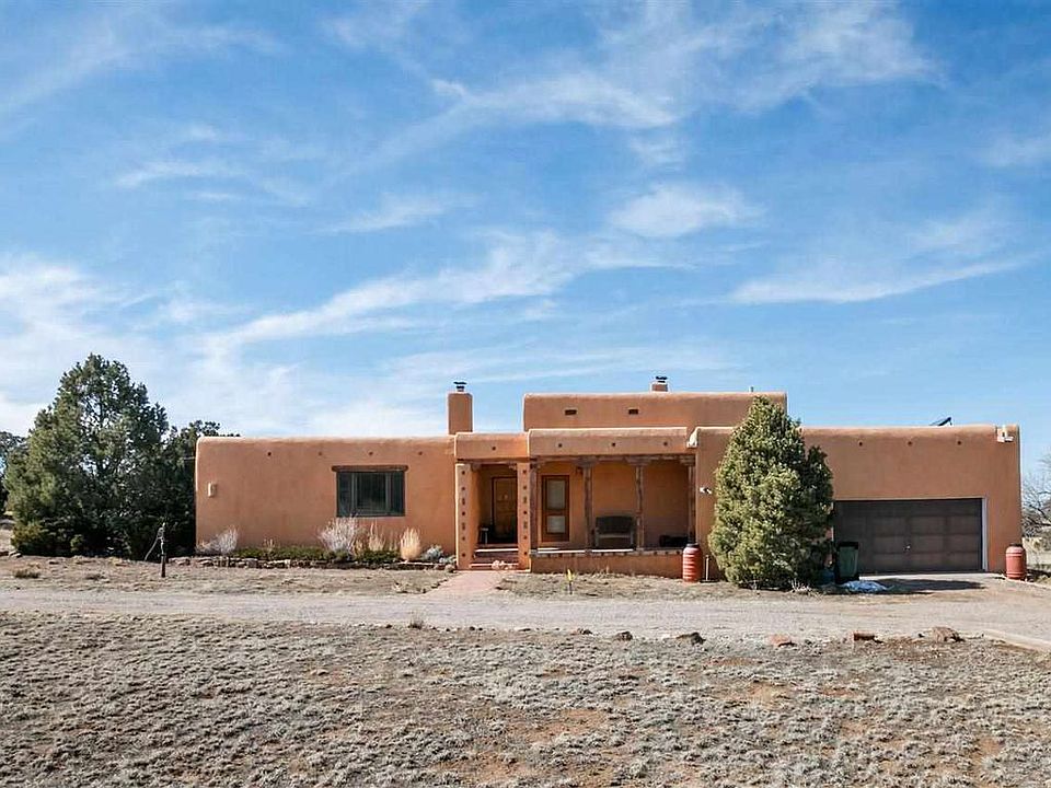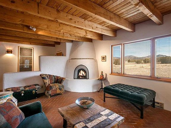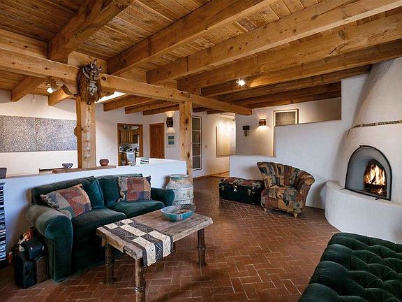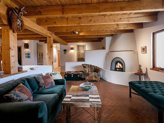 Located on a cul de sac bordered by huge greenbelt with expansive mountain views! Sit on your private deck and enjoy the quiet and peace. Lovely sunroom in this passive solar home creates an indoor winter patio. 2 kiva fireplaces and a woodstove add ambience in the living room, romance in the owner???s suite and supplemental heat in the den and country kitchen. Beam ceiling and herringbone style brick and tile floors plus an adobe entry wall add character and atmosphere. A broad gallery hall wit