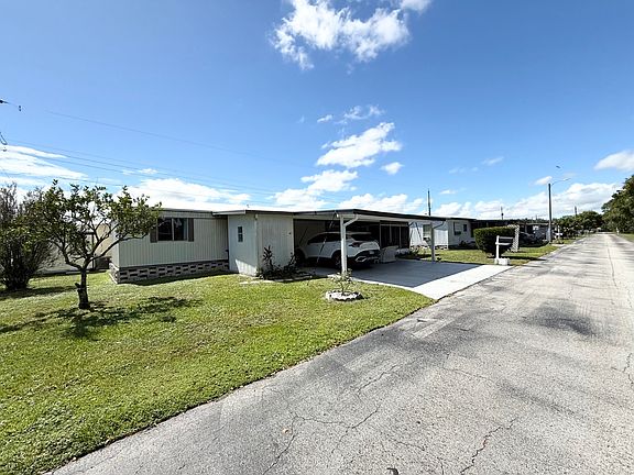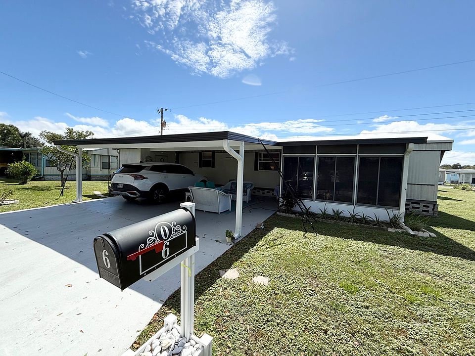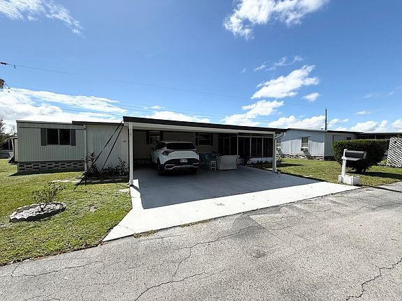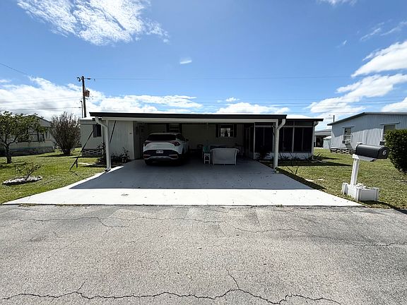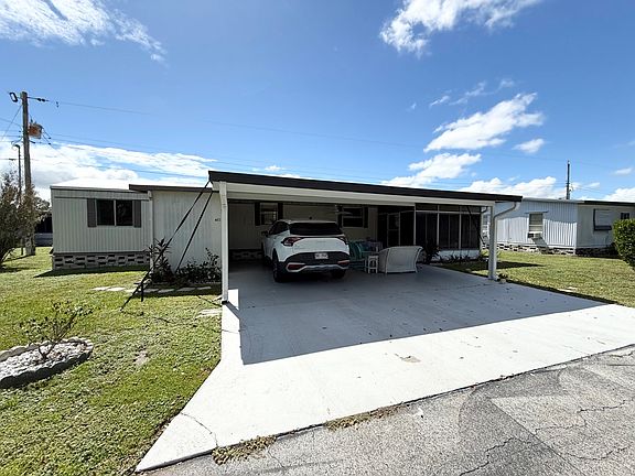 BRING OFFERS!!! SELLER IS VERY MOTIVATED!!! This home is located in the back of a quiet 55+ community with a lot rent of $585 a month which includes the use of the amenities! Some of the amenities include the use of the pool, shuffleboard, billiards and more! The water is billed through the community and runs less than $10 a month depending on usage. The average electric bill for this home runs anywhere between $75-$100 per month depending on usage. This park is in a great location and close to shopping, restaurants and medical facilities. There is a membrane roof on this home. The central A/C and heat unit which is only 3 years old and runs very efficiently. The best thing about this home is the location of it! It is located in the very back of the park and is facing no other homes which gives it a very private feel! Attached to the front of the home is a nice size carport which is NEW and has room to park your vehicles! You can easily use part of the carport as a covered patio! What a great place to sit outside and enjoy a cup of coffee! There is an attached shed underneath the carport with room to store your tools, etc. There is a door from the carport leading into a FL room which makes a nice additional sitting room. The windows in the FL room were installed just this year (2025). This room can also be converted into a screen room in the winter months when you want to enjoy the Florida weather! Step into the home and find a nice open floor plan. Both the living room and kitchen are centrally located in the home and are open to each other. Off the kitchen and toward the back of the home there is a small hallway leading to the laundry area so you don't have to go outside like most to do your laundry. The washer was replaced 1 year ago! There is a large full size bathroom w/ a tub/shower combo also at the back of the home along with a nice size bedroom with a large built in wardrobe. At the front of the home and off the living room is another small hallway leading to a full bathroom with tub/shower combo. This bathroom can be accessed from the hallway or the 2nd bedroom which could also make a nice office or craft room! This home has been very well maintained and would make a great snowbird or year-round residence. COME SEE THIS VERY WELL-MAINTAINED HOME FOR YOURSELF!!!