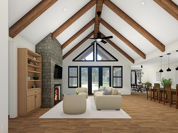 The great room impresses with vaulted ceilings, wood beam accents, custom built-in cabinetry, and a floor-to-ceiling stone fireplace with mantel-to-ceiling masonry. Wide-plank flooring flows seamlessly throughout, while upgraded 8' alder doors, full window wraps, and added soundproofing showcase thoughtful design.
