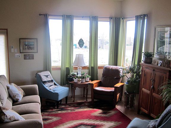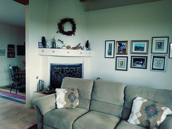 MOVE IN READY! 1.46 acre lot affords good distances from neighbors and great views of the Wave, Ortiz, Sandias and Jemez mountain. This home offers warmth, lots of natural light, bright, cheery and convenience. Living room with fireplace and vigas provides an inviting entertaining area. Open concept living room kitchen area with master suite conveniently separated from the other 2 bedrooms allowing privacy for guests . Mountain views from every room. Brand new roof . Brand new energy efficient mini-split heating and AC system. Wonderful passive solar. Selling furnished. Enjoy gorgeous sunsets from back porch. 2 car garage. The home is truly turn key. Buyers, and buyers with realtors welcome.