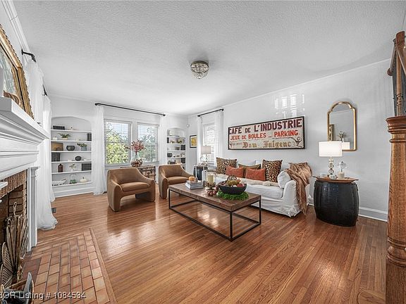 Gleaming wood floors, arched doorways, built-ins, and gas log fireplace with wood mantle
