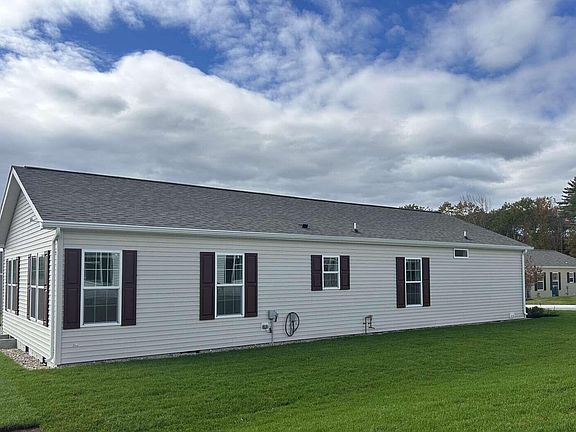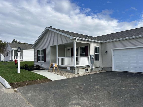 Beautiful 3-bedroom, 2-bath home in Phase IV of Blackberry Hill Village, the premier 55+ manufactured home community in Southern Maine. This Energy Star-rated home offers 8' ceilings, drywall construction throughout, propane gas, central air, and an attached oversized two-car garage that is fully insulated and finished. The split floor plan provides privacy, with the primary suite located at the rear of the home, featuring an extra-large walk-in closet and a private bath with double vanities, a step-in shower, and a grab bar for added safety. The second and third bedrooms are located at the front of the home and share a full bath. The bright, open eat-in kitchen includes white cabinetry, stainless steel appliances, a center island, built-in desk, and a dining nook with sliding door access to a 12' x 16' composite deck, perfect for relaxing or entertaining.