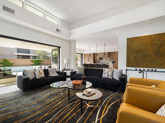 Welcome to 6 Garnet - an extraordinary residence in the award-winning community of Revelle at Clancy Lane, Rancho Mirage. Set against a breathtaking mountain backdrop, this striking contemporary home blends bold modern architecture with serene desert living. Clean lines, a sleek facade, and dramatic stone accents define its exterior presence.Spanning 3900 sq.ft., this highly upgraded 5-bedroom, 6-bath residence offers refined design and exceptional functionality.The living area is the home's centerpiece, with soaring ceilings, clerestory windows, and abundant natural light. A dramatic textured wall frames the sleek linear fireplace, while sliding glass walls open seamlessly to the outdoor entertainment space--perfect for indoor-outdoor living.The chef's kitchen features custom wood cabinetry, waterfall-edge stone countertops, and a spacious island. Professional-grade appliances, including a six-burner dual oven Wolf range, dual 36' Sub-Zero refrigerators with four freezer drawers, a Sub-zero beverage fridge and Cove dishwasher elevate the culinary experience. A fully equipped butler's pantry with a Sub-Zero wine fridge, Wolf microwave, warming drawer, walk-in pantry, ample storage and prep space ensure effortless entertaining. The dining area is modern elegant and warm, ideal for intimate dinners or large gatherings.The primary suite is a luxurious and spacious retreat with expansive windows opening to the patio. The spa-inspired bath offers a freestanding soaking tub, dual-head glass shower, double vanity, under-cabinet lighting with sliding glass doors opening to the outdoor jetted spa and fire pit.Two guest suites, thoughtfully separated from the primary, feature high ceilings, walk-in closets, and ensuite baths. A versatile fifth bedroom in the main house includes a custom Murphy bed, built-in bookcase, en-suite bath, walk-in closet, and private courtyard entry--perfect as an office, library, or guest retreat.A detached casita provides additional privacy with a seating area, sleeping space, and en-suite bath.The backyard is an entertainer's dream with multiple seating areas, a 65 ft. lap pool with waterfalls, built-in BBQ and motorized awnings.Additional highlights include a large laundry room, motorized shades, smart home technology, 22 owned solar panels, a whole-house water filtration system and a spacious 3-car garage equipped with Gladiator Gear Wall storage system. This house has everything you've dreamed of.