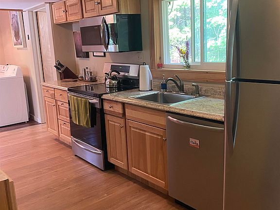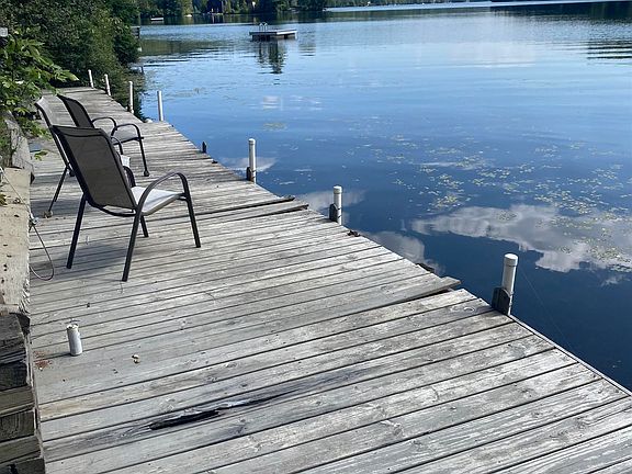 Welcome to your idyllic escape with private dock on the shores of beautiful Lake Raponda. This cozy 2 bedroom 1.5 bath house offers the perfect blend of rustic charm and modern comfort, nestled in a peaceful wooded setting minutes from downtown Wilmington and a short walk to your waterfront dock! Step inside to discover warm wood accents, open concept living and dining area on the main level with large central stone fireplace and a fully equipped kitchen ideal for entertaining. Step outside and enjoy the sunny deck ideal for quiet mornings or Al fresco dining. Second floor is home to the spacious primary bedroom with generous closet space and room for a King size bed. Lower level has second family room with 2 alcove sleeping spaces both with Bunk bed sets for fun sleepovers. Property includes the lot across from the home with nice storage shed and is perfect for parking and or a future garage space. Many nearby hiking trails for day hikes and or snowshoeing in the Winter. Large side yard offers great privacy. A short drive to both Mount Snow and The Hermitage Club make this a year round pleasure. The true highlight? A private dock and parking space with 116 feet along the shores of Lake Raponda. Let's go Boating!