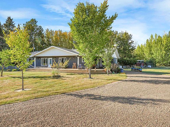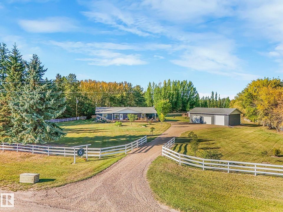 Welcome to the finest country living has to offer! This meticulously kept acreage spanning just over 3 acres in Sturgeon County just north of Gibbons features a 3 bedroom 2 bathroom bungalow style home, a massive triple car detached garage (in-floor heating) w/ two 8' doors and one 10' door (2025), a massive deck, fully fenced private yard, pole shed, a garden, and chicken coop! Stepping inside this home w/ over 2100 SF, you have a spacious kitchen w/ refinished cabinets & countertops, a dining room, living room and family room w/ a wood burning fireplace, both w/ easy access to the large deck on the front/back of the home. Down the hall is 3 spacious bathrooms & a 4pc bathroom. At the front of the home is a mud room, 3pc bathroom, and the laundry room. This home has received lots of recent upgrades w/ house roof redone (2010), shop roof (2016), septic maintained every 2 years, majority windows were redone (2024), and upgraded crawlspace insulation (2024). Located 7 mins to Gibbons & 20 mins to Edmonton!