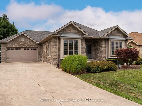 Backing directly onto the 11th hole of the Meaford Golf & Country Club, this all-stone bungalow offers sweeping views of the fairway and tranquil pond and unlike alot of other homes for sale on the course, this one is freehold with no monthly condo fees. Built in 2006 by respected builder Tom Clancy, its one of the best values in the area for golf course living.Nestled on a quiet cul-de-sac among other prestigious homes, youre just minutes to the marina and a short drive to Blue Mountain. The full stone exterior, symmetrical gabled rooflines, twin bay windows, and impressive front entry create timeless curb appeal. A concrete driveway leads to the oversized double garage, with plenty of parking for guests.Inside, natural light floods the space, highlighting the upscale finishes and craftsmanship. Hardwood floors run throughout the main level, while soaring ceilings create an airy, grand feel. The formal dining room features a tiered tray ceiling with pot lights, and the kitchen boasts rich wood cabinetry, a breakfast bar, and an open flow into the spacious living room with a gas fireplace and a wall of windows framing the golf course view. Step onto the elevated deck with glass railings and soak in the peaceful vista of the pond and manicured greens.The primary suite is generously sized with spectacular backyard views, a walk-in closet, and a spa-like ensuite with tiled glass shower, double vanity, and jacuzzi tub. A second bedroom or office, main floor laundry, add convenience.The finished lower level includes a rec room with walkout to the backyard, a third bedroom, 3-pc bath, and plenty of room to expand.If youve been dreaming of golf course living without the condo fees, this rare freehold property combines beauty, value, and an unbeatable lifestyle.