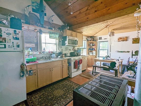 PRICED TO SELL! This cute Bungalow style home is bigger than it looks! The spacious kitchen has vaulted wood ceilings, oak cabinets, a dining area and all appliances stay. Living room has a slider that leads out to the back yard and entry area makes for a great mudroom. Home is heated by a wall furnace that is fueled by natural gas. Interior access to a big barn style garage that offers another 480 sqft of creative space w/ exterior access to a finished room above. Garage is insulated and has electric. Property consists of 3 partially fenced lots that are zoned Commercial, totaling a half acre with 240 feet of frontage. Conveniently located on a quiet side street while being nearby to highways, shopping & beaches. The exterior was painted and roof redone in 2019. Some updates have been done and some are needed. Property will not qualify for FHA or VA financing. Seller is having a new septic installed. Great opportunity for buyers needing storage!