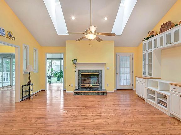 HONEY, STOP THE CAR! One level living at its best! This one will take your breath away! Through the foyer, you will be showered with natural light in the great room with the vaulted ceiling, skylights, gleaming hardwood floors, fireplace and built-in bookshelves and cabinetry. The home has a desirable split bedroom floor plan with two bedrooms, a full bath, and home office/craft room on one side, and the spacious master bedroom with two walk-in closets on the other. The kitchen features quartz counters, white cabinets and loads of storage! Off the dining room is the light-filled sunroom with access to the hot tub that conveys. The rear yard offers a potting shed, swing, firepit, and access to the large dry storage room below the office.