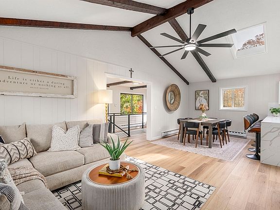 Large deckModern kitchenInviting open-concept layoutYear-round lake viewsCathedral ceilingsDesirable lake neighborhoodStylish walk-in shower