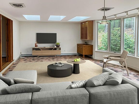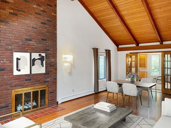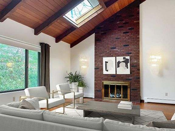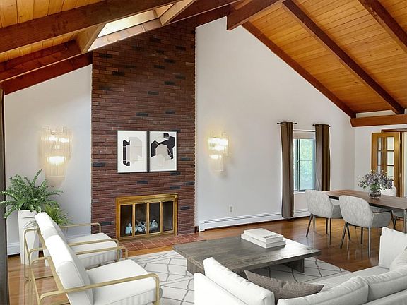 Contemporary split entry on a side street with private lot on over 2/3 of an acre of land. Wonderful open floor plan with soaring ceilings, skylights and a great layout providing one floor living with a family room off of the kitchen that opens to a large deck (with a natural gas grill) and yard. The well finished lower level allows some separation space- with a fireplaced playroom and office (possible bedroom). In the desirable Estabrook School District, convenient to 128 and Wright Farm conservation area.
