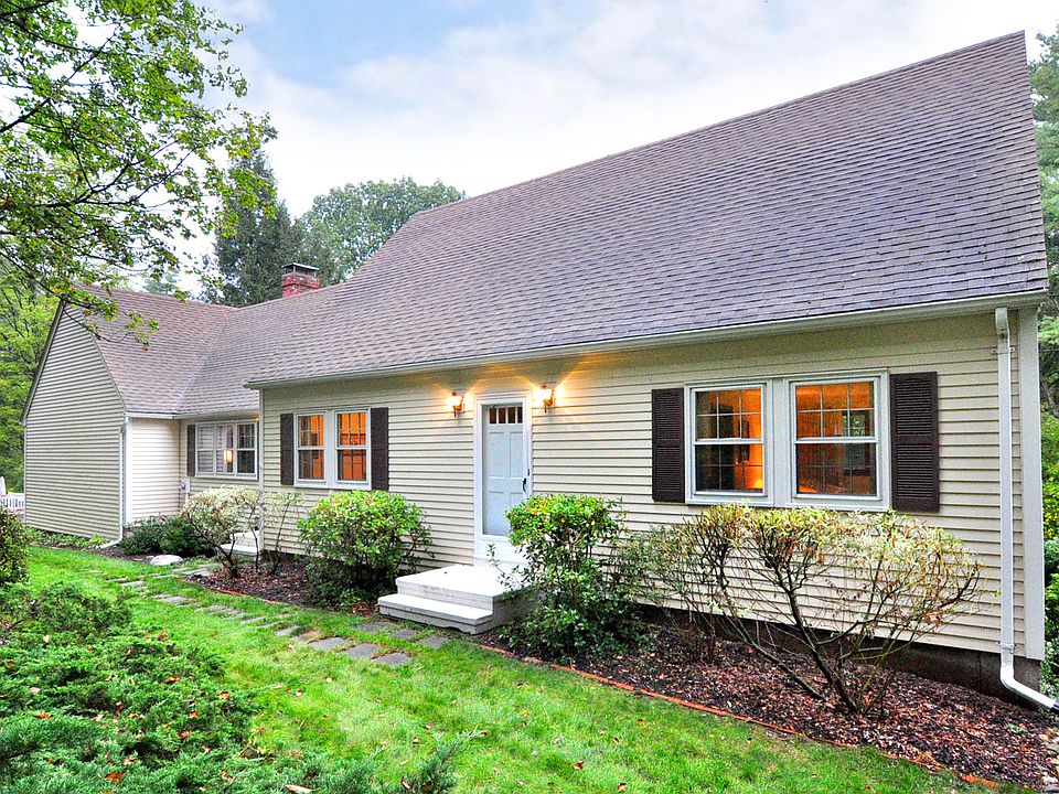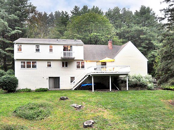 Come and see this spacious and sunlit 3 BR Contemporary Cape on a cul de sac in Canton Valley! This beautiful home was built in 1978 and is situated on over an acre of land while in a popular subdivision. Move right into this home boasting a family room with cosy woodburning fireplace, sliders to a large deck overlooking the serene and private yard with trees and rock walls.The family room leads to a large, eat-in kitchen updated with hardwood floors and granite counters. There is a first floor half-bath with enclosed laundry. The dining room has a pass-through door. The front door opens to a slate central hall with coat closet, stairs to the second floor and entrance to the formal, front-to-back living room with windows to the front, side and back yards. The second floor has three bedrooms and two full baths. The primary suite has a full bath with sliders to a balcony looking out to the back yard, a walk-in closet and vaulted ceiling with skylights. There are two other bedrooms with hardwood floors and another full bath on the second floor. The large, walkout basement is sunny and dry with a rec room area, possible office or workout area and two storage/utility rooms. Sliders lead to the beautiful backyard from the walkoout lower level. The sellers have recently taken some large pines down in the backyard. Easy to show and ready to go! Don't miss this lovely home!