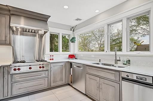 Stunning 5 BR 3 BA home w/ open floor plan overlooking the Fells Reservation. Gourmet kitchen w/ SS appliances, tile floor, & Wolf gas range w/vent hood. Sun drenched DR w/ HW floors has French doors opening to a patio w/ views of Fells Reservoir. Bright LR features fireplace, built-ins & HW floors. Master bedroom w/bath & walk-in California closet. FR w/FP & wet bar. Central A/C, alarm,water pressurizer. Hunter-Douglas window treatments.