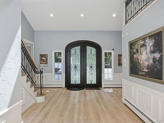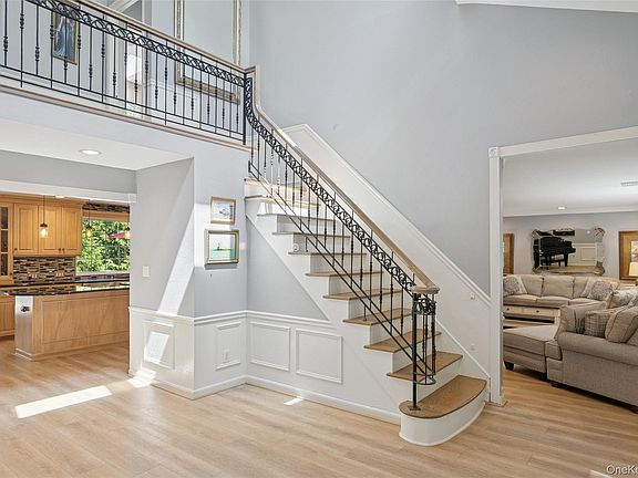 This exquisitely renovated 4-bedroom and 4-bath center-hall Colonial with an open floorplan features a spacious entry foyer that leads to a bright and airy formal living room with a bay window and a palatial-sized dining room with a butler’s pantry that has a wet bar and beverage/wine refrigeration. The spacious chef’s kitchen features a center island with an integrated recessed marble pastry board, stainless appliances that include a professional-grade Thermador range, an extra-large kitchen dining area, plenty of pantry space, and a charming kitchen pellet stove. Adjacent to the kitchen is a comfortable family room with a floor-to-ceiling stone fireplace with a wood-burning insert and French doors to the exterior. The expansive master suite is designed with a vaulted ceiling, a balcony, a romantic fireplace, a generous walk-in closet, and a spa-like master bath. Additional bedrooms are sizable with ample closet space. The lower level is fully finished with a suite and would also be ideal for a home office, gym, or recreation room.