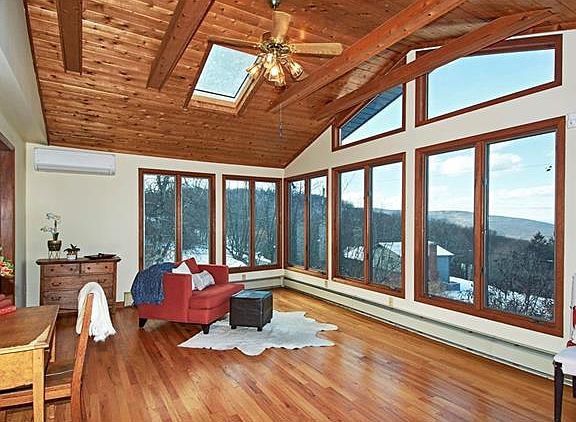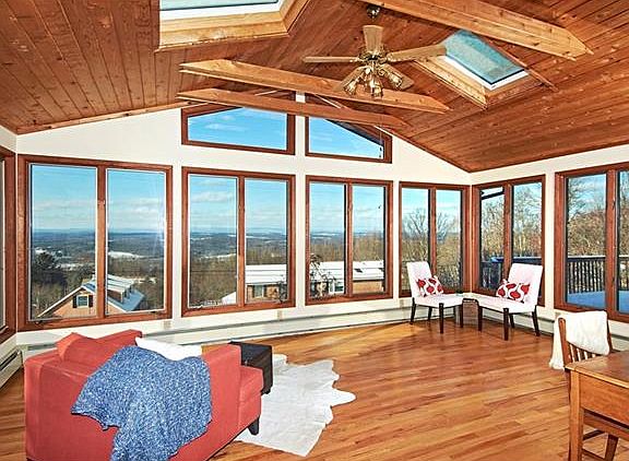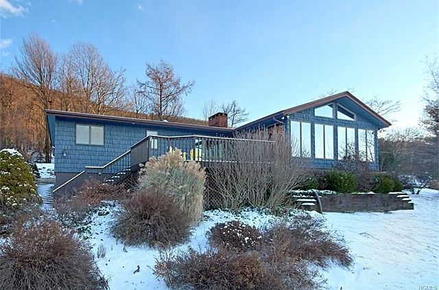 Spectacular panoramic views welcome you to this custom built, Adirondack style ranch house. Located in a neighborhood on top of a mountain that offers privacy in a beautiful setting yet less than 10 mins to town. Enter into a huge Great Room with beamed ceilings, skylights and a wall of windows that showcase breathtaking views of the Shawangunk Mountains and evening sunsets. Open flow to the living room and dining room separated by a pass through fireplace and backed by a wall of windows. Renovated eat in kitchen w granite countertops, custom wood cabinets, stainless steel appliances and a built in desk. Large Master bedroom suite with 3 walk in closets and full bath, 2 additional bedrooms, full bath, hardwood floors, and wood 6 panel doors complete the 1st floor. Lower level features a large family room w wood burning stove, blt in bkcases , laundry rm, full bath, and door to garage. With a huge front deck and yard backed by Black Rock Forest preserve, this is a one of a kind home.