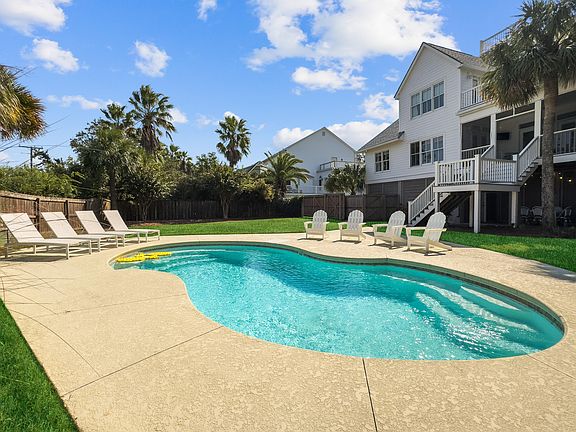 This elevated and beautifully renovated beach home captures sweeping front porch views of the Wild Dunes Harbor Golf Course, along with panoramic sights of the Intracoastal Waterway and Isle of Palms Marina from the rear. Just a short walk from the beach, this turnkey property is ideal as a coastal getaway or a high-performing rental investment.Thoughtfully furnished with high-end pieces and local Charleston artwork, the home features 4 bedrooms, 2 full bathrooms, and a spacious 3-car garage with additional storage.As you enter, the living room welcomes you with an open, inviting feel that flows effortlessly into the kitchen, equipped with stainless steel appliances and a spacious center island perfect for gathering. To the left, the dining area offers aformal space for meals, while to the right, the den provides a cozy retreat for relaxed lounging or casual entertainment. Step outside to a large screened porch overlooking a private, fenced backyard with an inviting saltwater pool. The main level also includes two bedrooms and a full bathroom, which conveniently houses the brand-new washer and dryer. Each bedroom features custom touches, with thoughtful details throughout. Upstairs, the primary suite offers a private deck with water views and a spa-like en suite bath featuring a marble shower, dual vanity, and elevated finishes. Additional highlights include a 14-foot-wide cantilevered gate for boat storage, an outdoor shower, and backyard access to Islander 71 and the Isle of Palms Marina. Situated just blocks from the beach and close to local shops, restaurants, and all that Isle of Palms has to offer, this exceptional home is a true blend of coastal luxury and lifestyle.