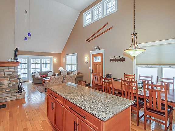 Experience the charm of your very own ski retreat near Mount Snow and The Hermitage Club. This stunning 4-bedroom, 3-bathroom home perfectly blends mountain living with modern comfort. Located in the heart of Vermont's ski country, the property offers convenient access to skiing, outdoor adventures, and breathtaking natural surroundings and direct access to Vermont's extensive snowmobile trail network. From the moment you arrive, the home's picturesque exterior, featuring shingle and clapboard siding, and a welcoming front porch. Inside, the open-concept living area is designed for both comfort and entertaining, with vaulted ceilings, large windows that flood the space with natural light, and a stunning stone fireplace as the focal point. The gourmet kitchen boasts granite countertops, stainless steel appliances, and warm wood cabinetry, while the adjoining dining area comfortably accommodates family and friends. The home features four spacious bedrooms, including a charming bunkroom perfect for families. The primary suite offers forest views and a private en-suite bath, providing a tranquil retreat after a day on the slopes. The fully finished lower level serves as a second living space, complete with a cozy den, large TV, and ample room for games and relaxation. A thoughtfully designed mudroom with custom storage cubbies and boot warmers ensures your ski gear stays organized and ready for your next adventure.