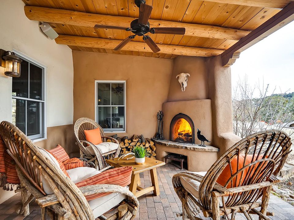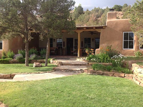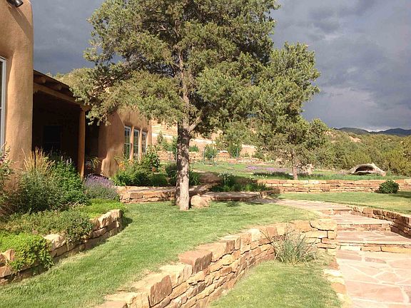 A rare opportunity to own this exceptional adobe home that was built by Andrew Geer in 2009 in an exclusive 70 year old gated family-owned compound only minutes to the historic Santa Fe Plaza. The home has too many special features to mention all of them. High ceilings, brick floors, stainless steel appliances, an antique cooking stove, super large pantry and so much more! It offers an open floor plan that opens out into an extended living space on the portal with a fireplace. The easily maintained landscaping offers terracing with old homestead building rocks from a ranch near the Colorado border. There are established ORGANIC beds that offer strawberries, raspberries etc as well as many fruit trees. Every window in the home offers beautiful, serene views of this very special property. You will see some of the largest Pinon trees ever!