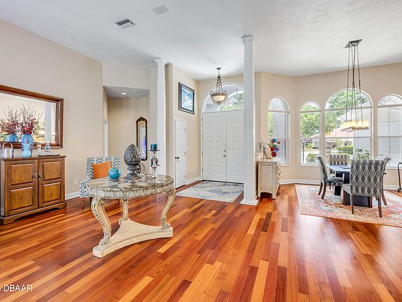This home is in close proximity to European Village, within a mile to golf courses and only 5 minutes to the BEACH! Nestled at the end of a quiet cul-de-sac in desirable Palm Coast, Florida, this stunning 4-bedroom, 3-bathroom pool home offers 2,760 square feet of luxurious living. Step inside to discover an immaculate interior with soaring high ceilings and upgraded finishes throughout. Upon entry, you're greeted by an elegant formal dining room and a spacious family room—perfect for entertaining. Adjacent to this space is a well-appointed kitchen, complete with granite countertops, a breakfast bar, stainless steel appliances, a wine refrigerator, and abundant cabinet space. The kitchen flows seamlessly into the bright eat-in nook and cozy living room, which features a fireplace and direct access to your outdoor oasis. This thoughtfully designed home offers a split-bedroom layout, ensuring privacy and comfort. The expansive primary suite boasts private sliding glass doors to the backyard, a luxurious en suite bathroom with dual sinks, walk-in closets, a soaking tub, and a separate walk-in shower. Step outside to the true heart of the homeyour very own private retreat. Enjoy a sparkling in-ground pool, an above-ground spa, and a large screened-in lanai, perfect for relaxing or entertaining year-round. This home beautifully blends comfort, elegance, and Florida lifestyle living.