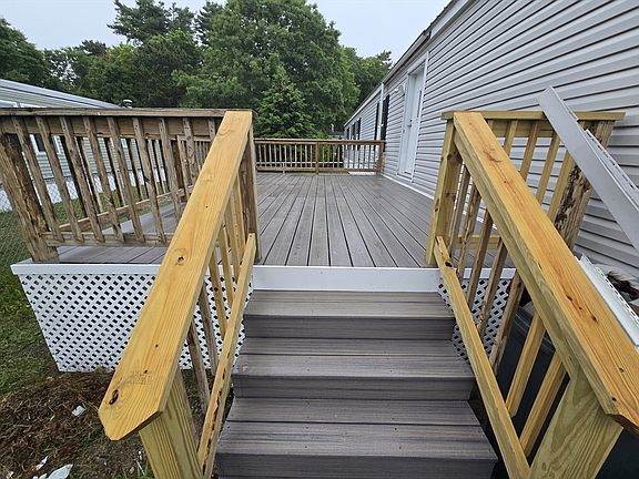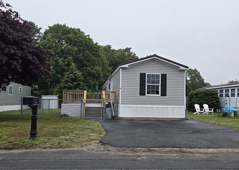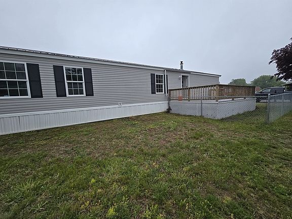 This updated 2013 manufactured home in a 55+ community is move-in ready! A spacious 22x12 deck with new composite flooring and a fenced-in area (perfect for the park’s pet policy) welcomes you home. Enter into a bright living room with sunny windows, new flooring, fresh paint, and a ceiling fan. The updated kitchen boasts new LG appliances (frig, stove, micro, cooktop, LED lights, garbage disposal), an island, breakfast bar, and dining area. A laundry room with washer/gas dryer and outdoor access. The master bedroom features a large closet and en-suite bath with walk-in shower, double vanity, and built-in shelves. A second bedroom at the front is adjacent to a full bath with tub. Convenient, stylish, and comfortable living awaits!