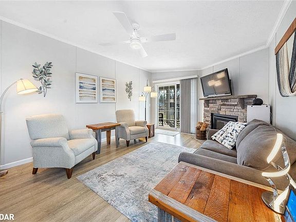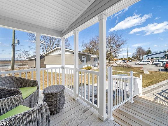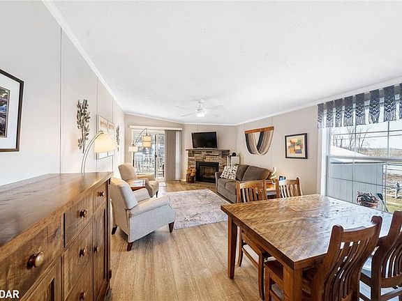 IMMACULATE INSIDE AND OUT! WELCOME TO 6 MALL SQUARE. THIS HOME AND PROPERTY ARE EXTREMELY WELL KEPT. A FANTASTIC LOCATION, JUST STEPS TO THE RECREATION CENTRE AND FITNESS CENTRE. ARRIVING YOU CANT HELP BUT NOTICE THE CARE AND DETAIL INTO COMFORTABLE LIVING. THE EXTERIOR HAS BEEN UPGRADED WITH A CUSTOM INTERLOCKING WALKWAY WRAPPING THE PROPERTY, WIDE ENOUGH FOR YOUR GOLF CART! CUSTOM RAILINGS AND COVERED FRONT PORCH. AS YOU ENTER THERE ARE 2 ENTRY CLOSETS FOR STORAGE. THE KITCHEN FEATURES LOTS OF CUPBOARD SPACE, QUARTZ COUNTERS, HIGH END LIGHT FIXTURES, BUILT IN DISHWASHER AND MICROWAVE, A GAS STOVE AND A COFFEE BAR AREA. THIS AREA IS OPEN TO THE DINING/LIVING AREA, WARMED BY A GAS FIREPLACE AND MANTLE. THE LIVING ROOM STEPS OUT TO A FULLY SCREENED IN PORCH AND THEN OUT TO THE REAR DECK. THERE IS A GENEROUS SECOND BEDROOM AND A 4 PC MAIN BATH. THE MASTER AREA FEATURES A LARGE WALK-IN CLOSET, ENSUITE BATH AND NICE NEWER CARPETING. THIS HOME IS LOCATED IN SANDYCOVE ACRES WITH AMAZING AMENITIES. 2 SALT WATER POOLS, 3 BANQUET HALLS, FULL FITNESS CENTRE, RESIDENT GARDENING AREA, PICKLE BALL COURT, WOODWORKING SHOP AND MORE! LAKE SIMCOE IS JUST A FEW BLOCKS AWAY. AN EASY PLACE TO SETTLE DOWN COMFORTABLY AND WELL WORTH A VIEW